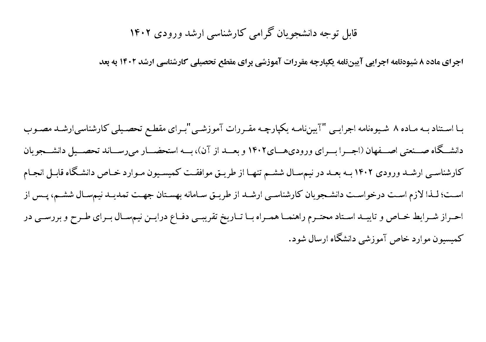 اجراي ماده 8 شيوهنامه اجرايي آييننامه يكپارچه مقررات آموزشي براي مقطع تحصيلي كارشناسي ارشد 1402 به بعد اجراي ماده 8 شيوهنامه اجرايي آييننامه يكپارچه مقررات آموزشي براي مقطع تحصيلي كارشناسي ارشد 1402 به بعد.docx
