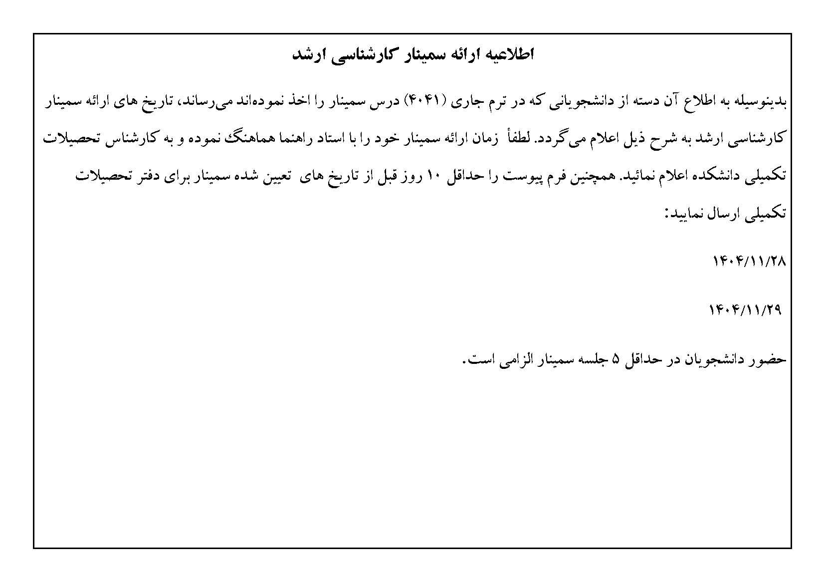 اطلاعیه ارائه سمینار کارشناسی ارشد اطلاعیه ارائه سمینار کارشناسی ارشد.pdf فرم مربوط به سمینار فرم سمینار (2)(1).DOCX